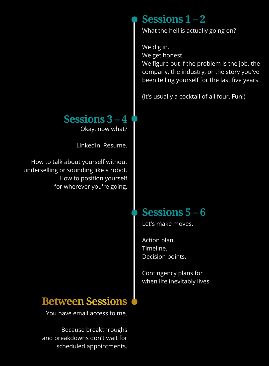 (45 min each, every other week) Real talk. Hard questions. BS detection. I'm like a human MRI for your career.